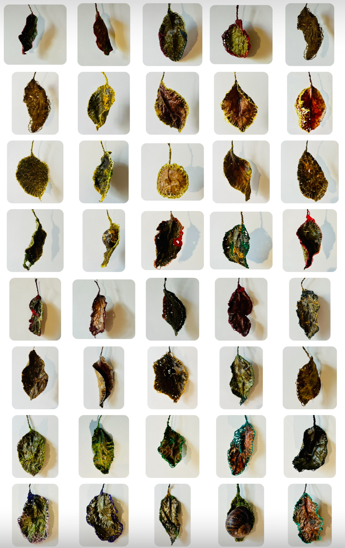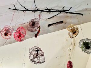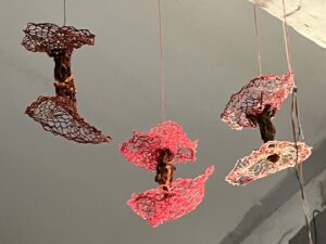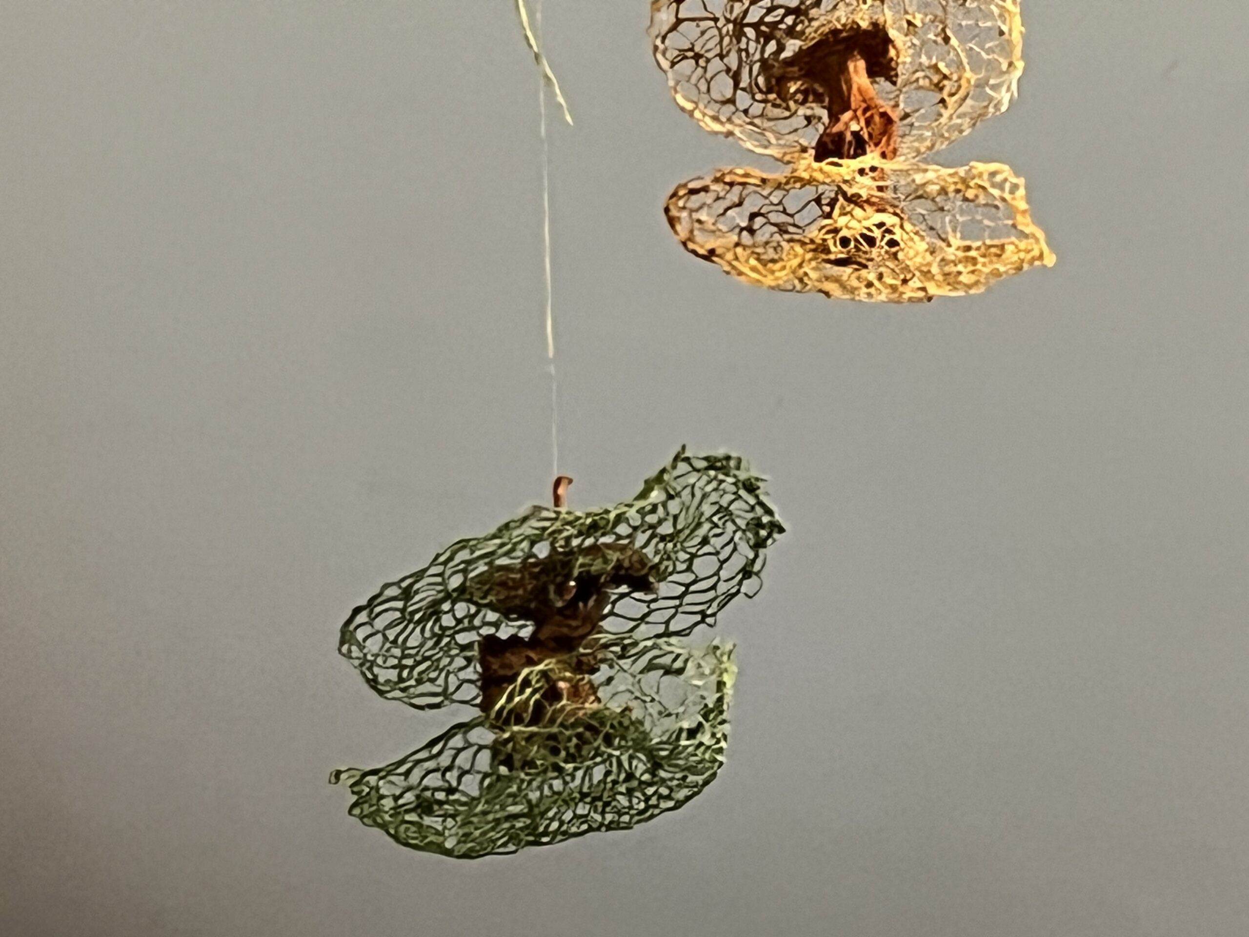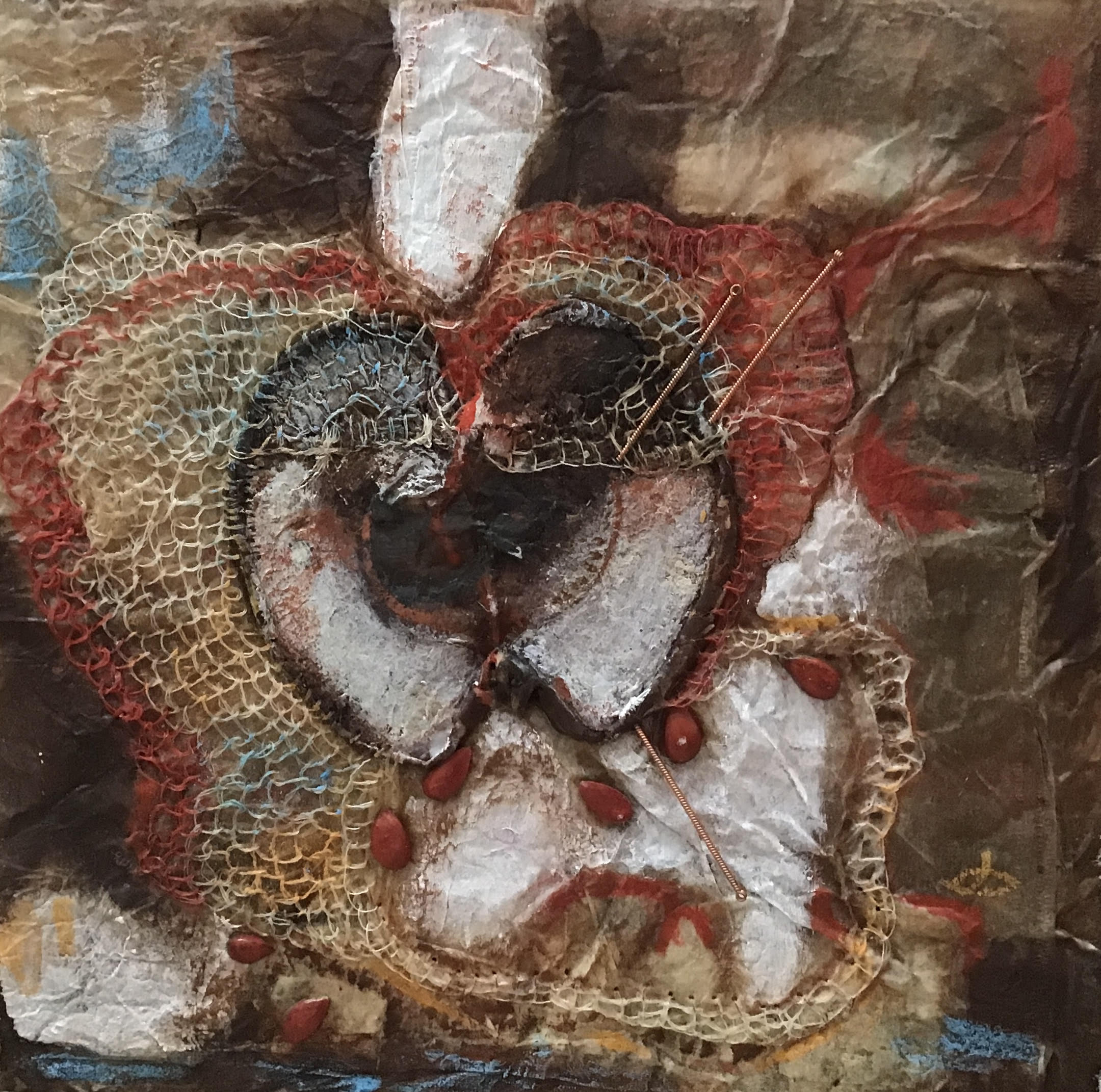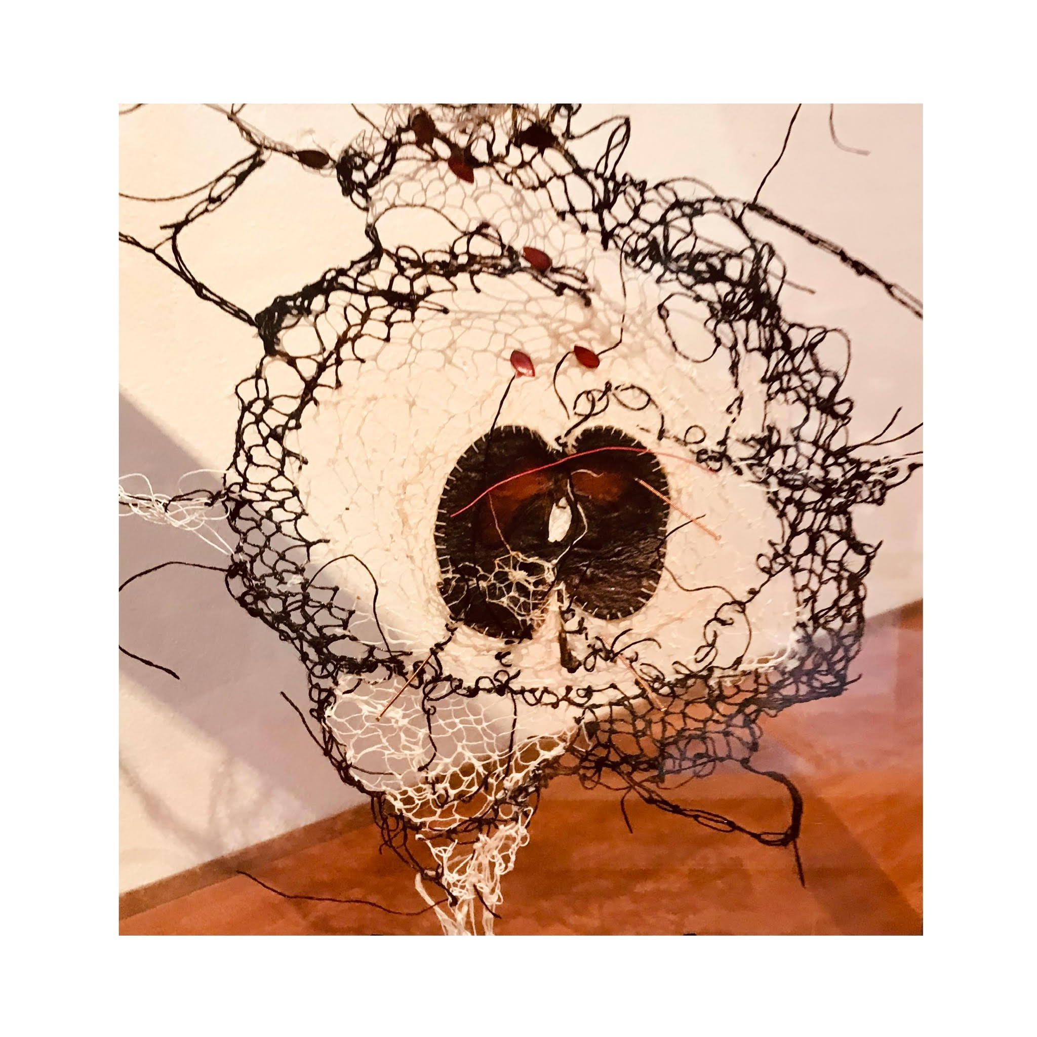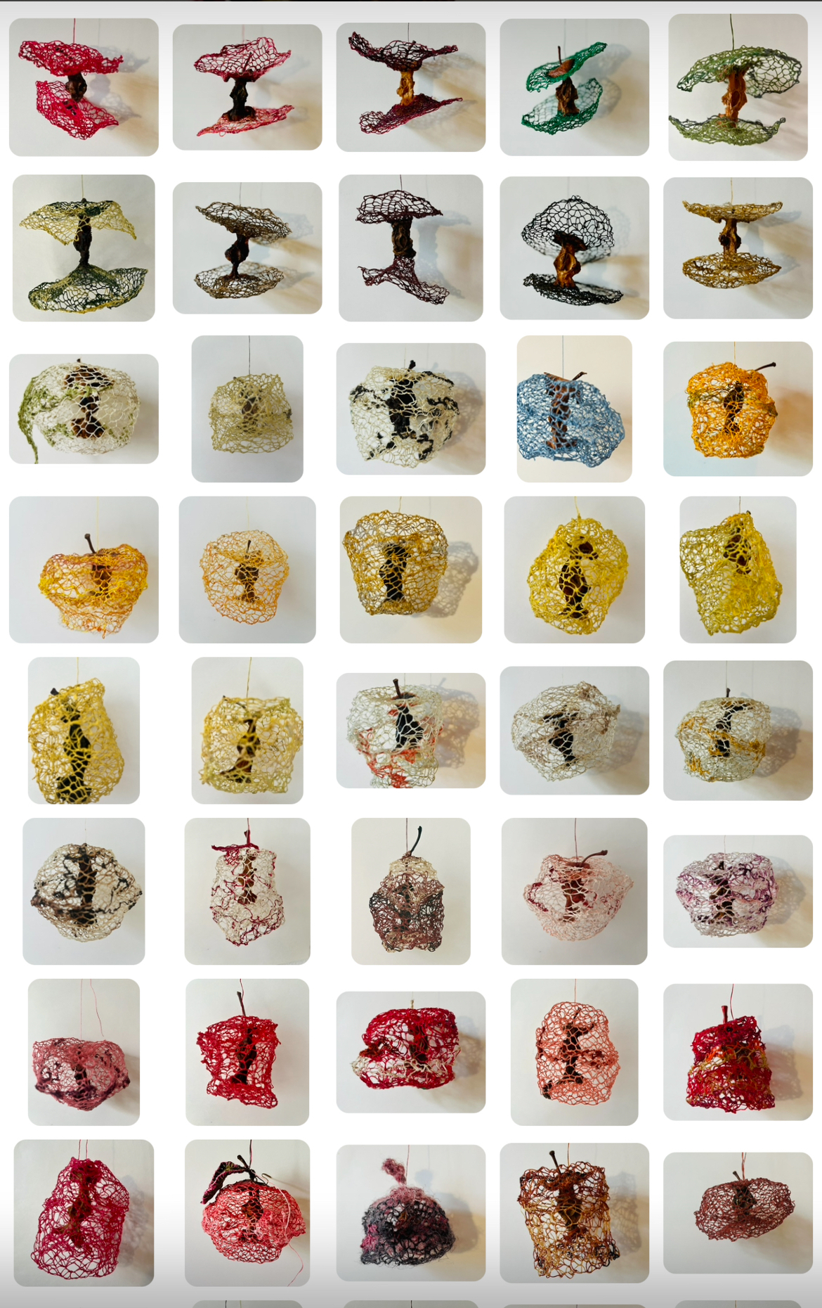 A travers mes pommes, les cabossées, je parle de résilience avec l’histoire d’un trognon, un être humain qui a traversé beaucoup de turbulences depuis l’enfance et qui se remet en question. Le trognon tout petit à force d’être mangé, mordu, écrasé par la vie, ne veut pas en rester là. Il a donc décidé de reprendre les fils de sa vie. C’est ainsi que le trognon de pomme attend son heure en séchant pour grandir et renaître. Puis de fil en fil une enveloppe se tisse autour de lui pour qu’il redevienne une forme, un peu cabossée car la pomme a vécu. L’essentiel est qu’il s’est reconstruit à travers les fils. Le résultat semble aérien mais dans l’espace entre trognon et fils flottent les douleurs subies. Elles ne se soupçonnent pas car invisibles aux yeux de tous. Entre fils et trognon l’intervalle transparent montre la victoire.